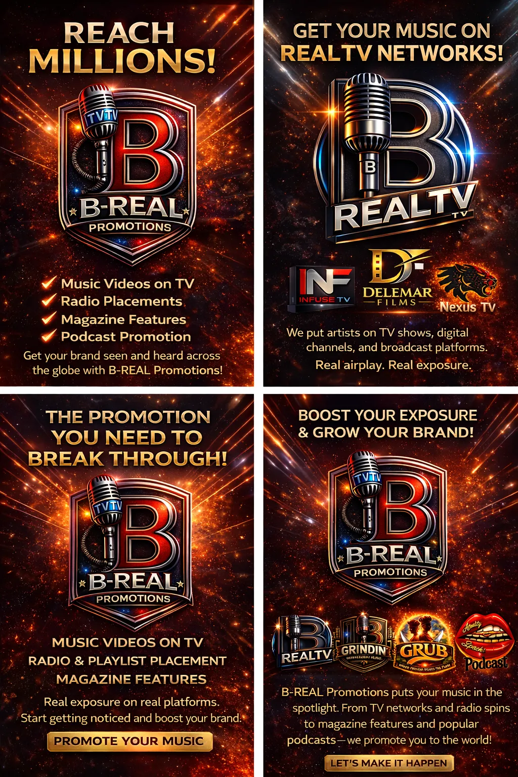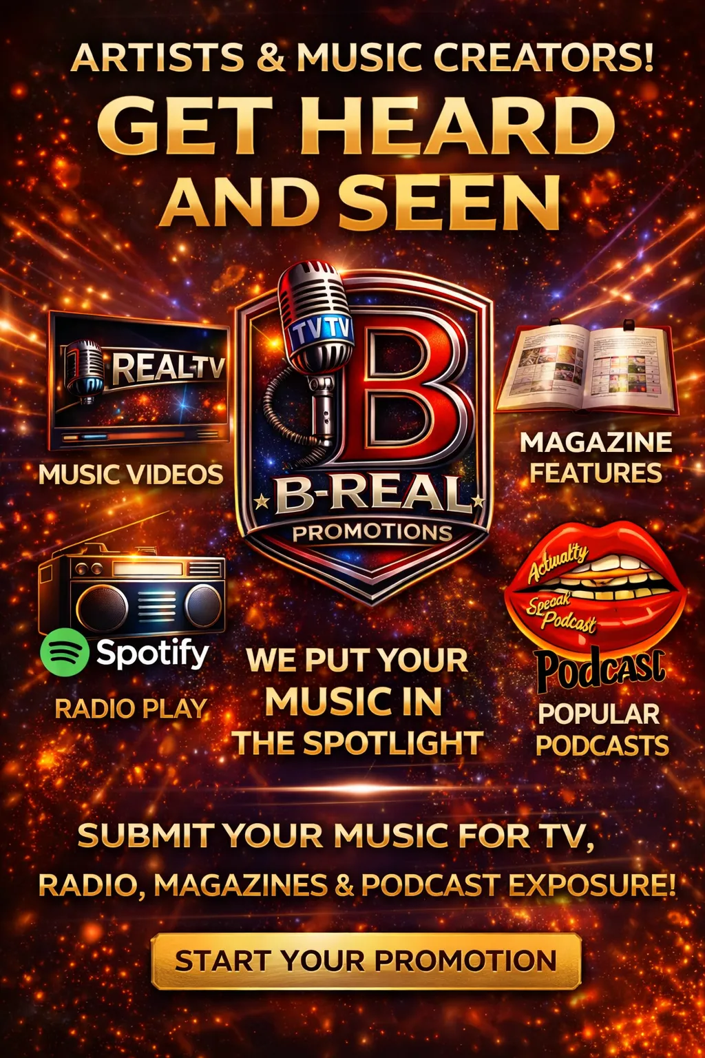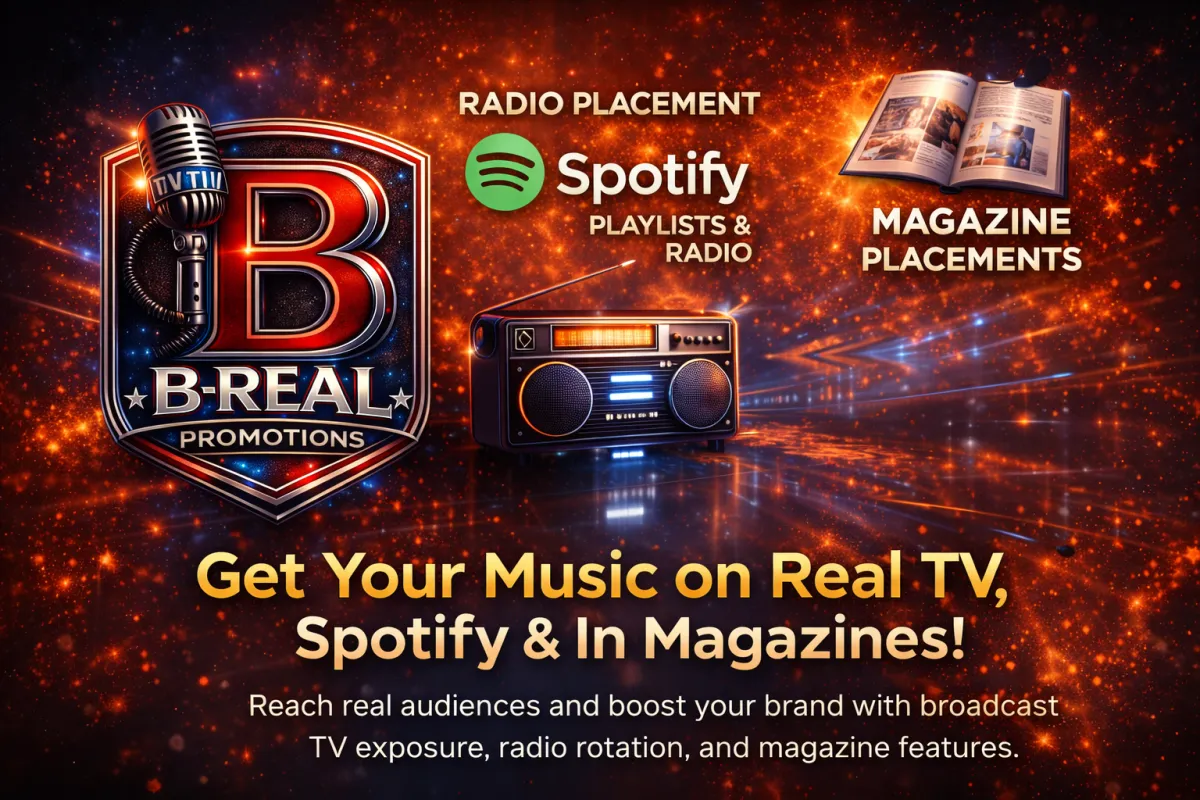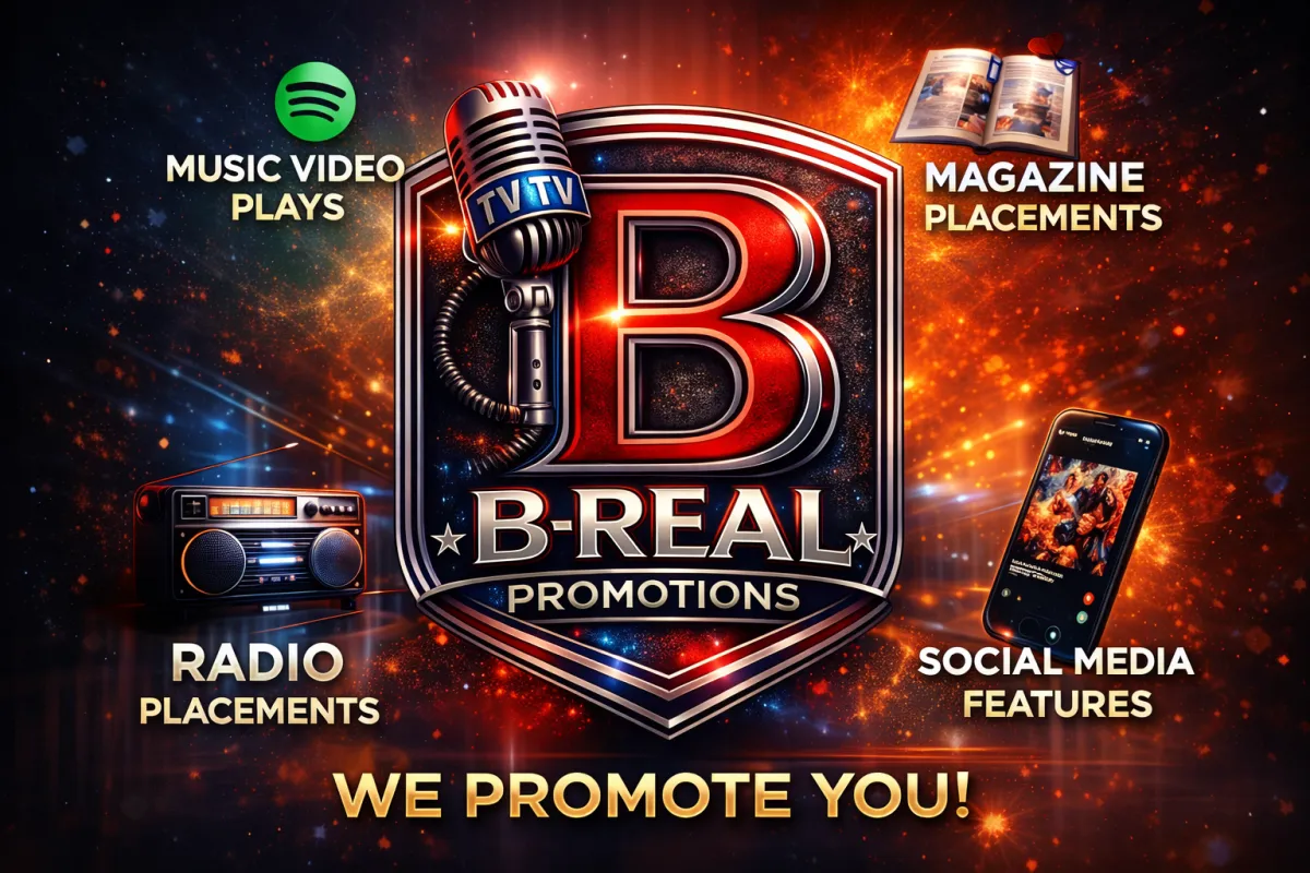 At B-R.E.A.L Promotions, we specialize in pushing independent artists to the forefront of the music scene. Whether you're looking for radio airplay, Spotify placements, magazine features, or banner ads, our promotional power gets your music in front of the right audience.